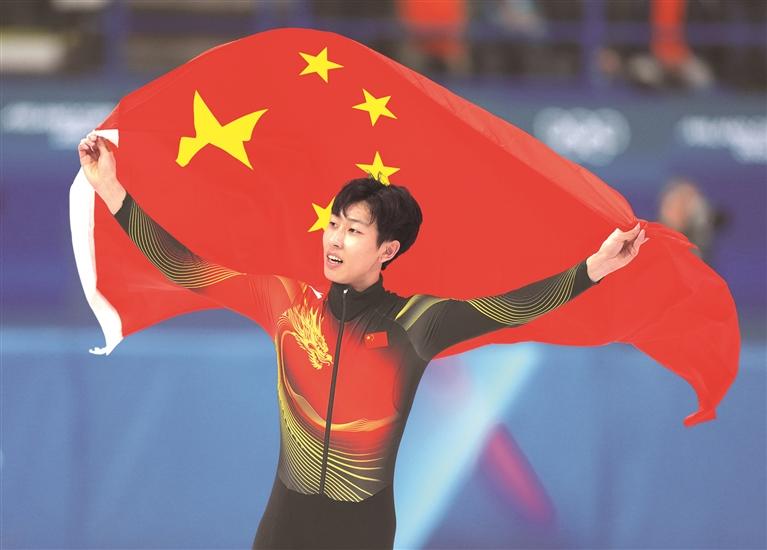 2月12日,孙龙在比赛后身披国旗庆祝。 新华社记者 薛宇舸 摄
