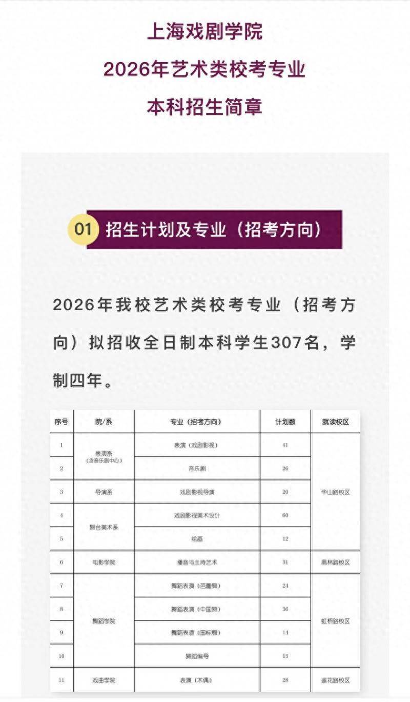 元旦假期最后一天,上海戏剧学院率先发布2026年艺术类校考专业本科招生简章,其中表演系的戏剧影视表演和音乐剧专业一共招收67人,作为全国第一个开设木偶专业本科教育的院校,上戏戏曲学院也将继续招收木偶表演专业。而舞台美术系的戏剧影视美术设计在新生入学时将不分专业方向,第一学年根据学生的学习情况及意愿定向分流为舞台设计、灯光设计、服装与化妆设计方向。所有进行艺术类校考的专业,除终试为现场考试外,均为线上考试,初试将在1月10日—13日期间进行。招生简章中明确了对有“不诚信”“不道德”和“违法违纪”行为记录的考生,将实行“一票否决制”,取消校考成绩。