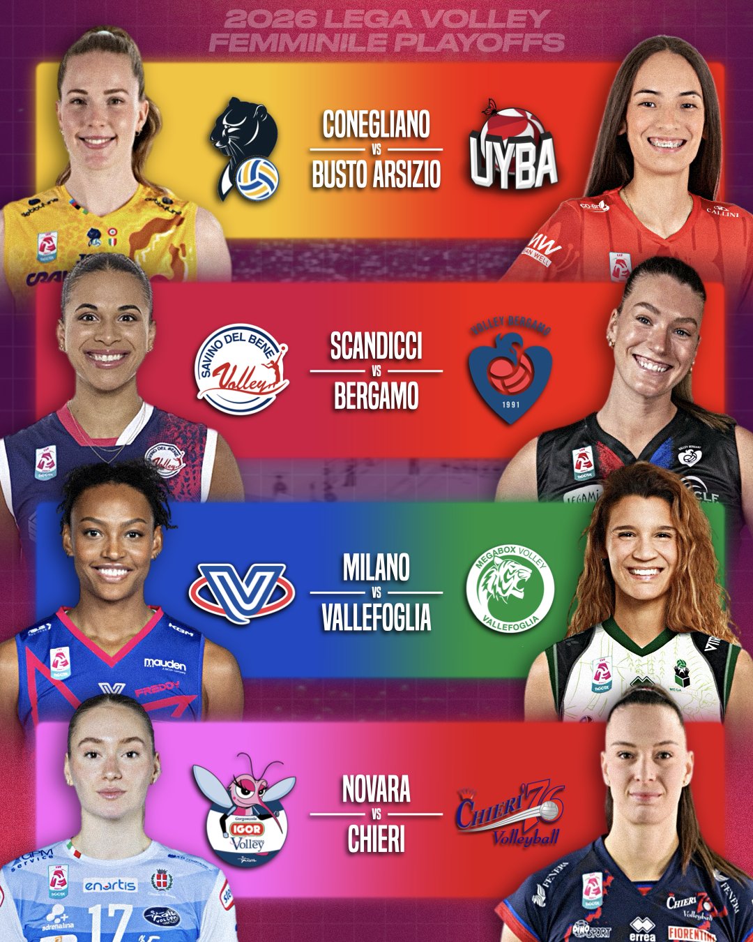 至此,意大利女排甲级联赛常规赛全部结束,前八名球队成功锁定季后赛席位,随着排名确定,季后赛对阵形势也随之揭晓【上半区】科内利亚诺vs布斯托阿斯奇奥、诺瓦拉vs 基耶里【下半区】米兰女排vs瓦莱福利亚、贝尔加莫vs斯坎迪奇。